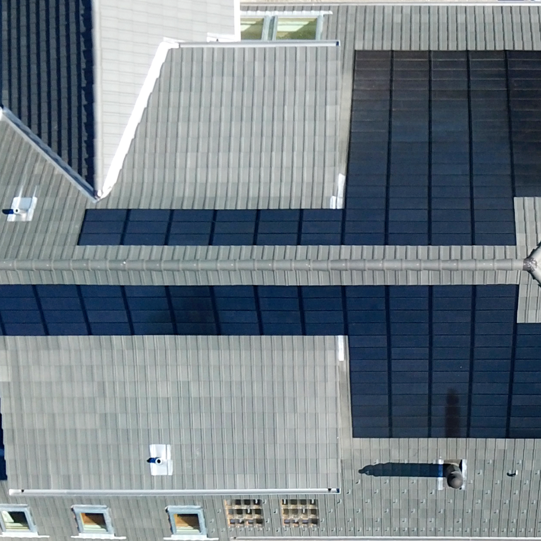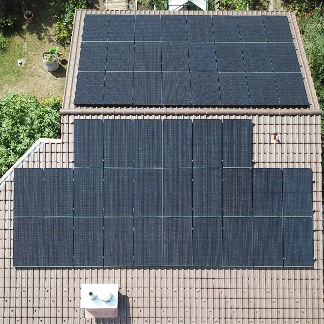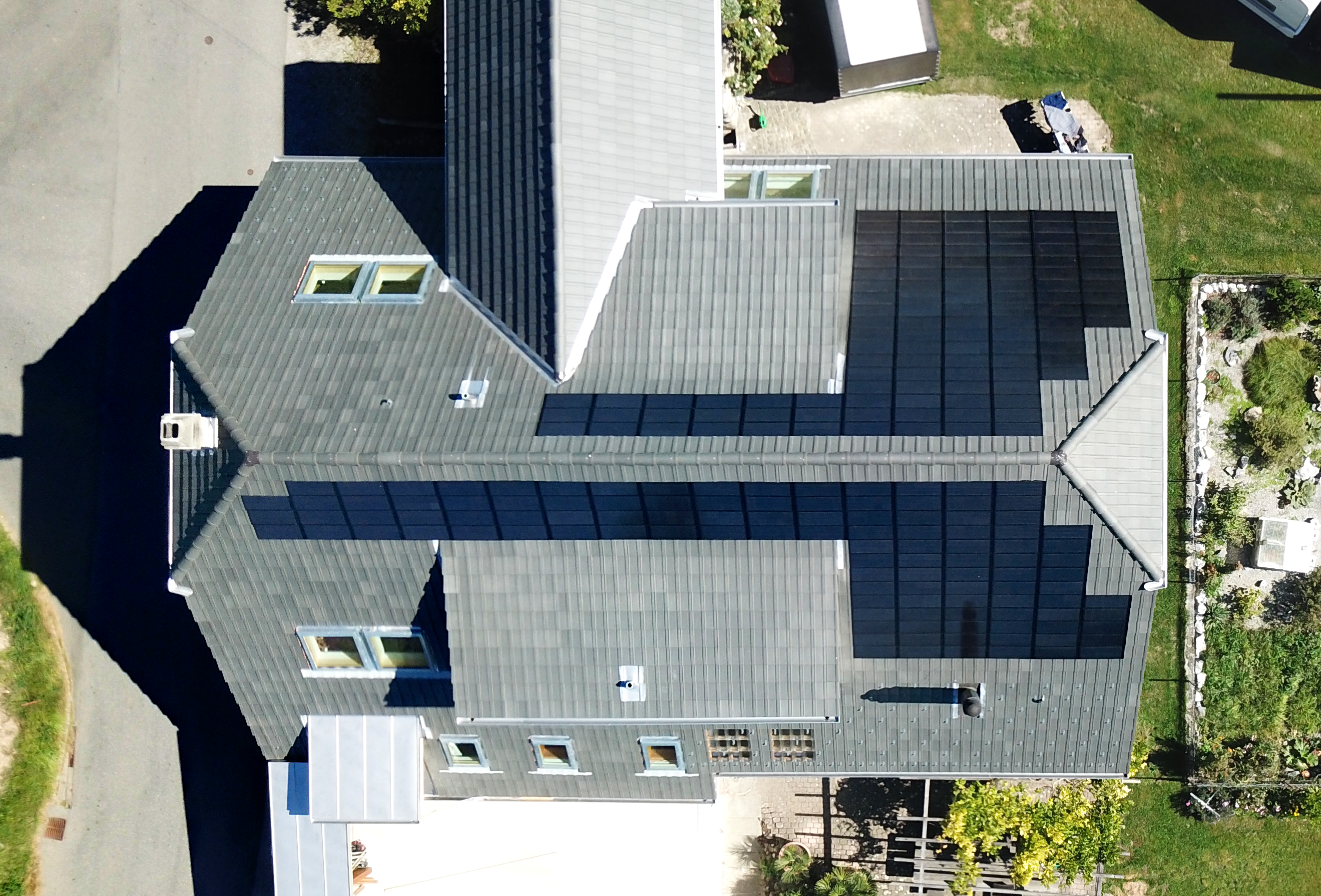 Dachsanierung mit anthrazitfarbenen Ziegeln und nahtlos integrierten Panotron Indachmodulen. Baujahr: 2019