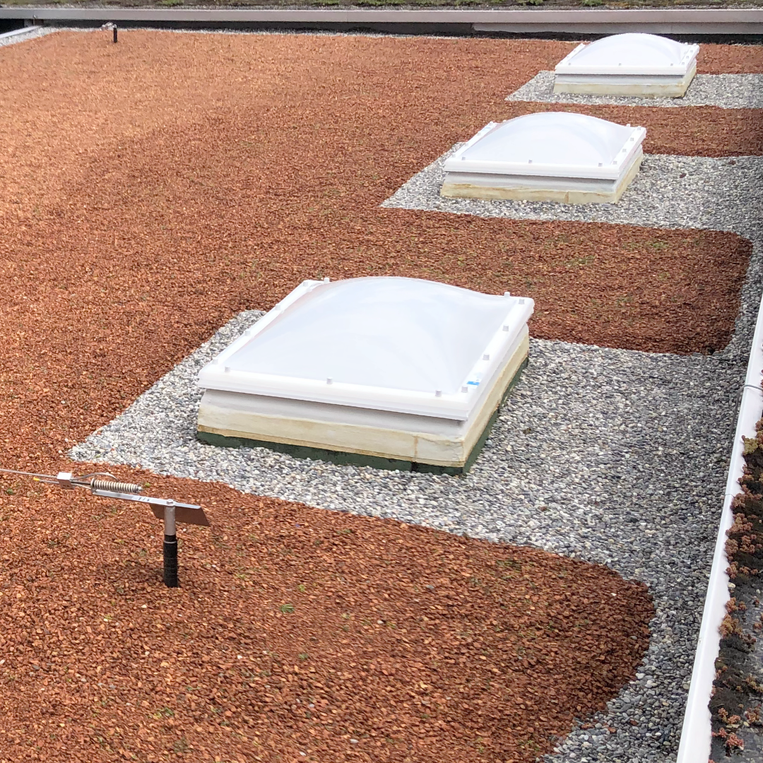 Flachdach-Neubau mit aufgesetzten Lichtkuppeln, Flachdachsubstrat für extensiv Begrünung. Baujahr: 2023