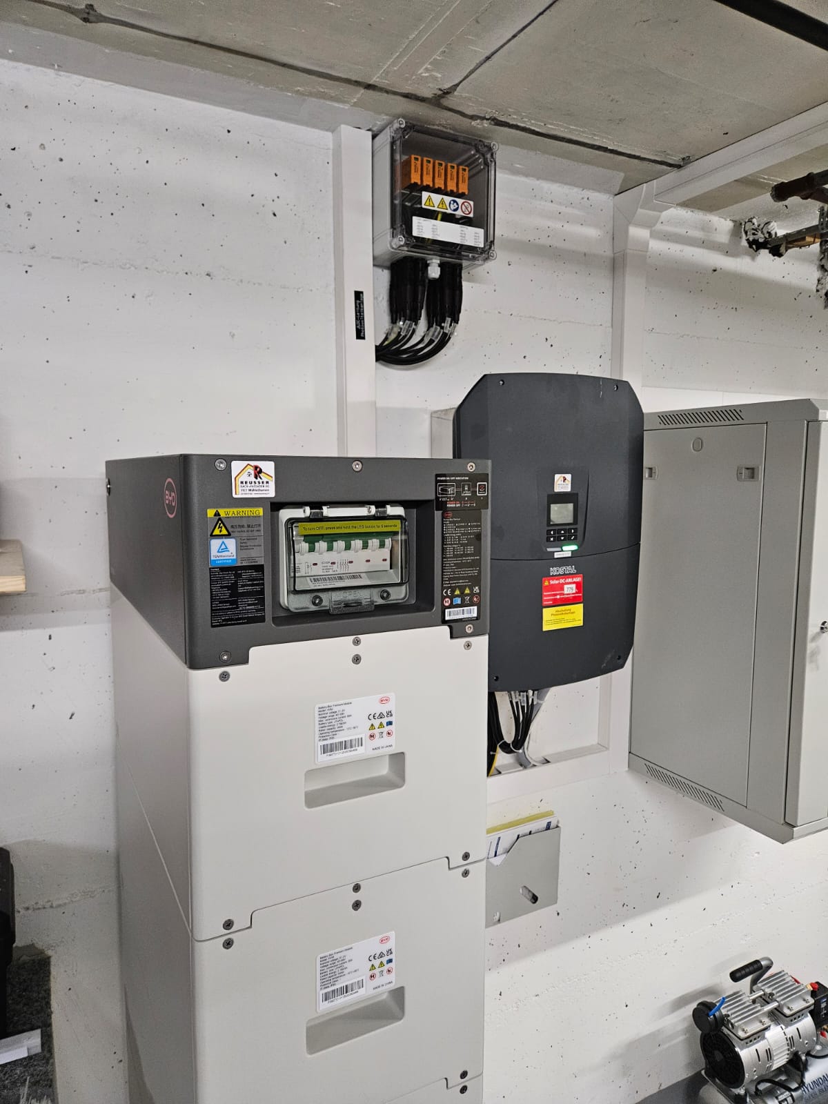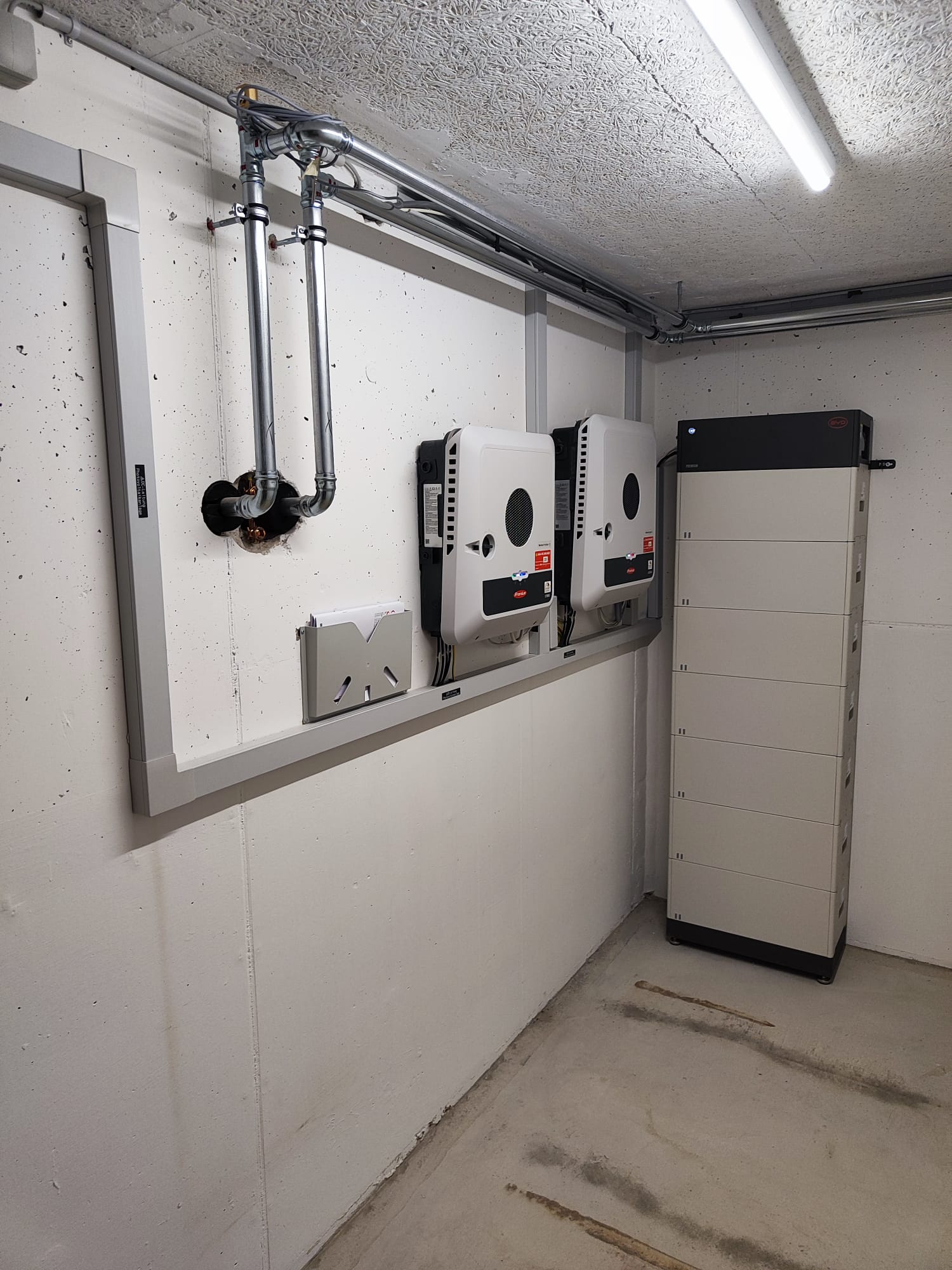 Solaranlage mit zwei Fronius Gen 24 Wechselrichtern und angebauten BYD-Batterieturm. Angebaut auf einem Einfamilienhaus in Gerzensee.